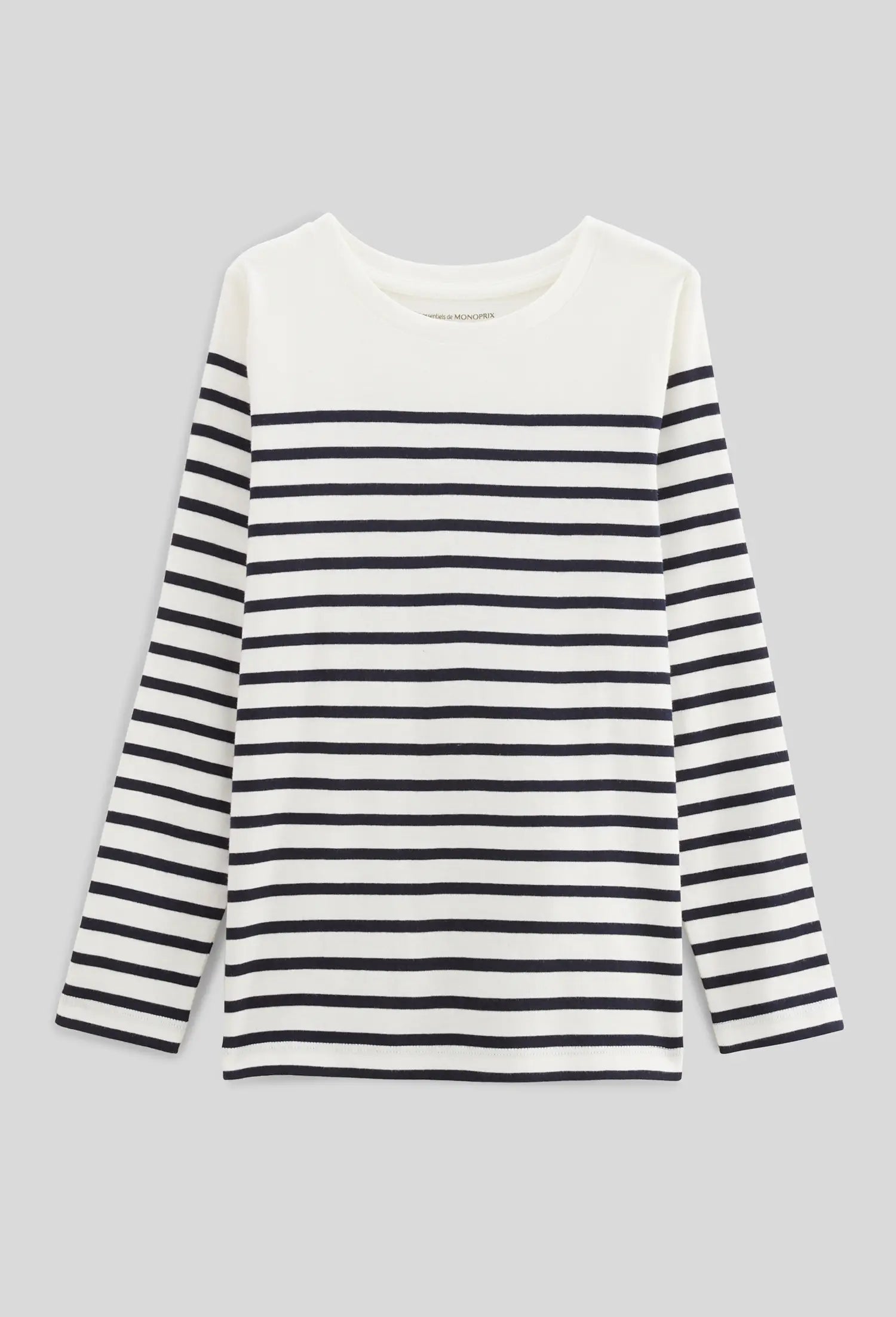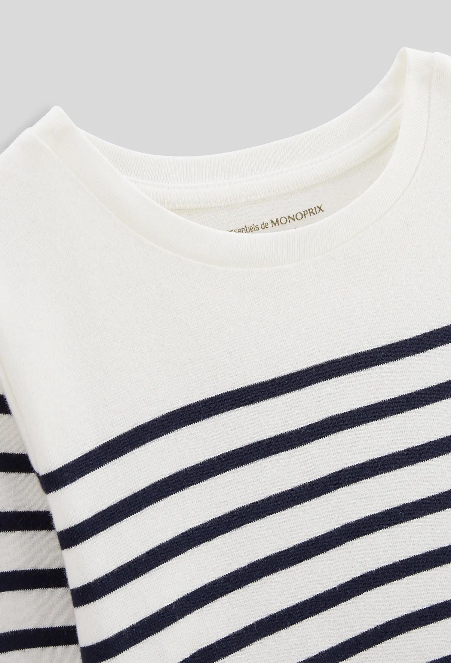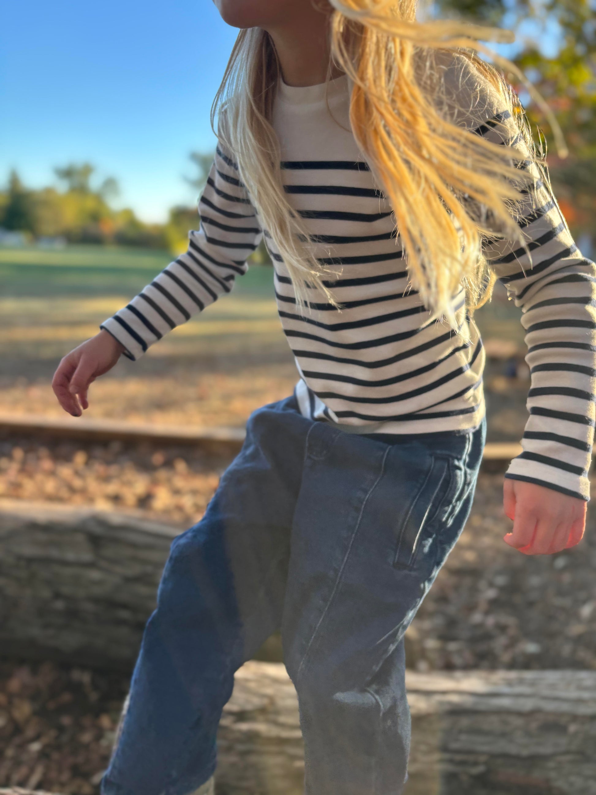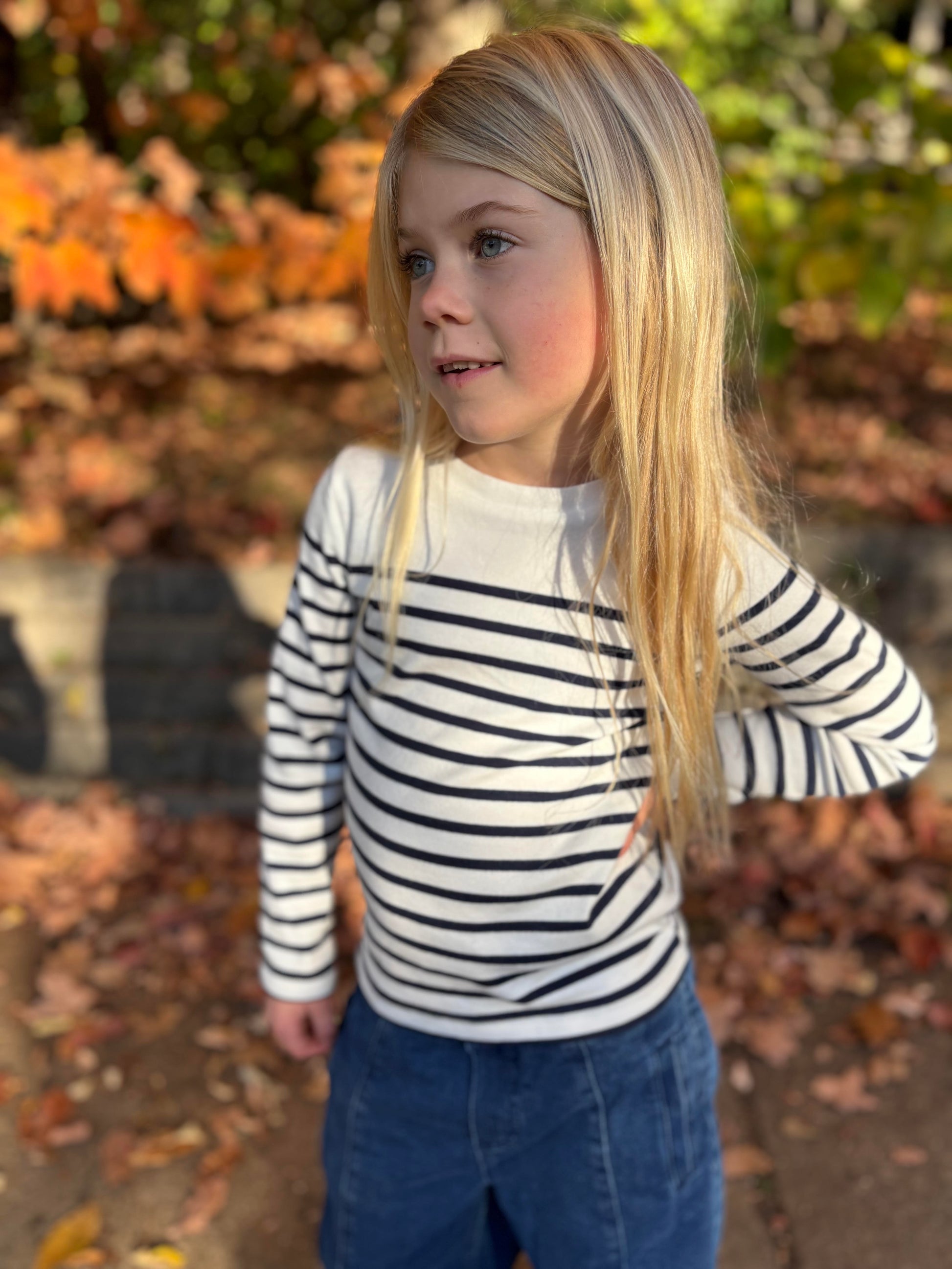 A true French classic, reimagined for play. The Marseille Marinière is crafted from 100% organic cotton with the iconic navy-and-white Breton stripes that never go out of style. Originally worn by sailors along the southern coast, this timeless piece now brings effortless Parisian cool to the everyday. Perfect for layering in cooler months or wearing solo on sunny days, Marseille is as versatile as it is stylish — a wardrobe staple your big kid will live in.