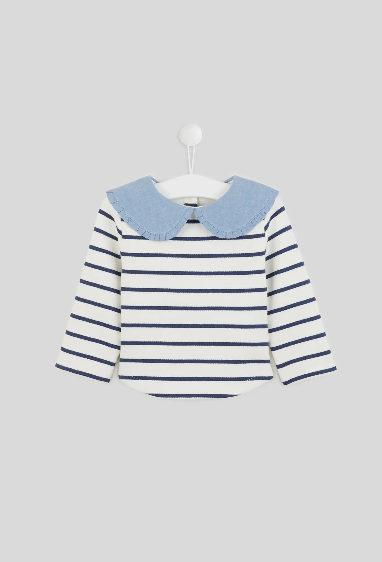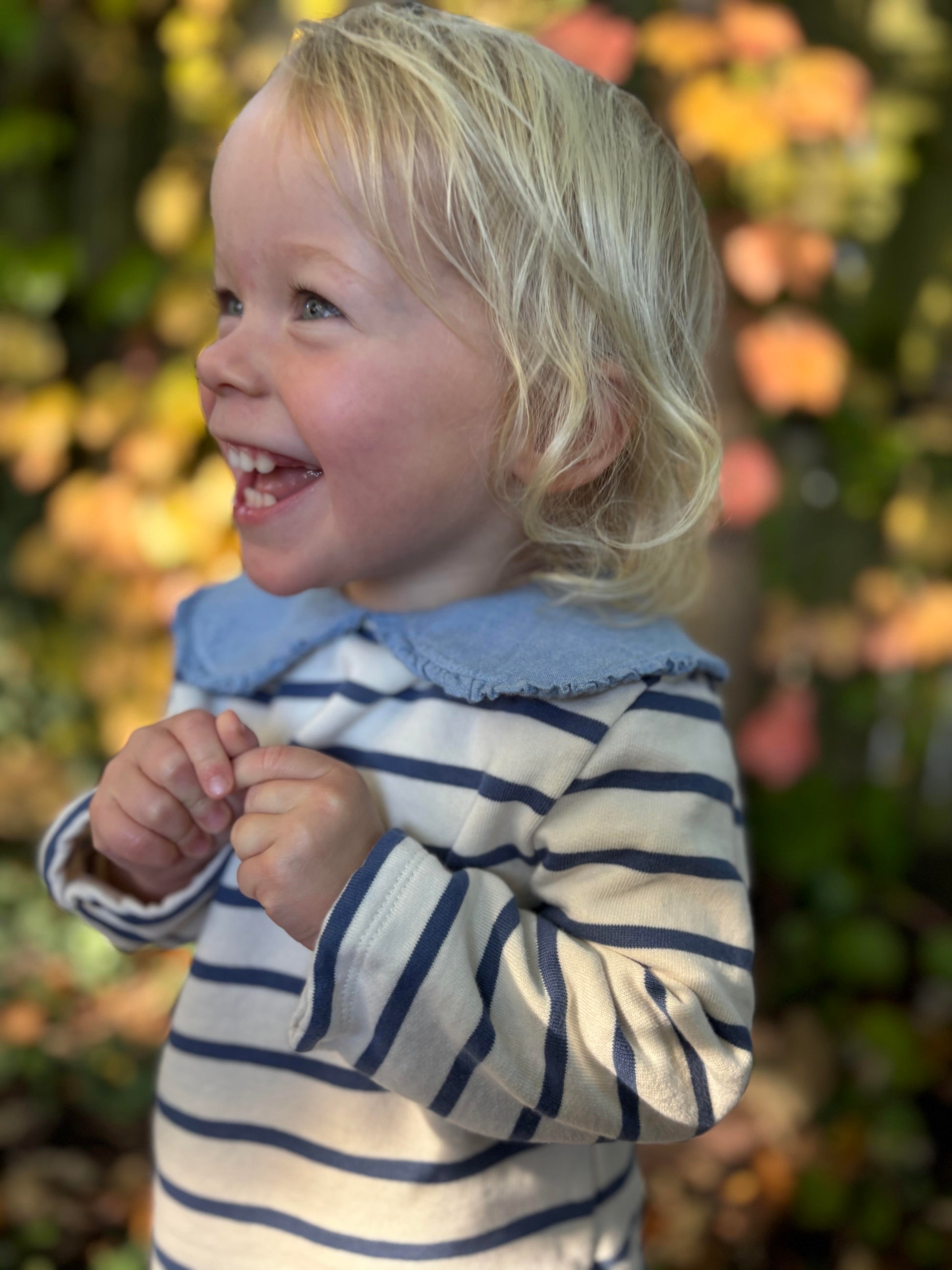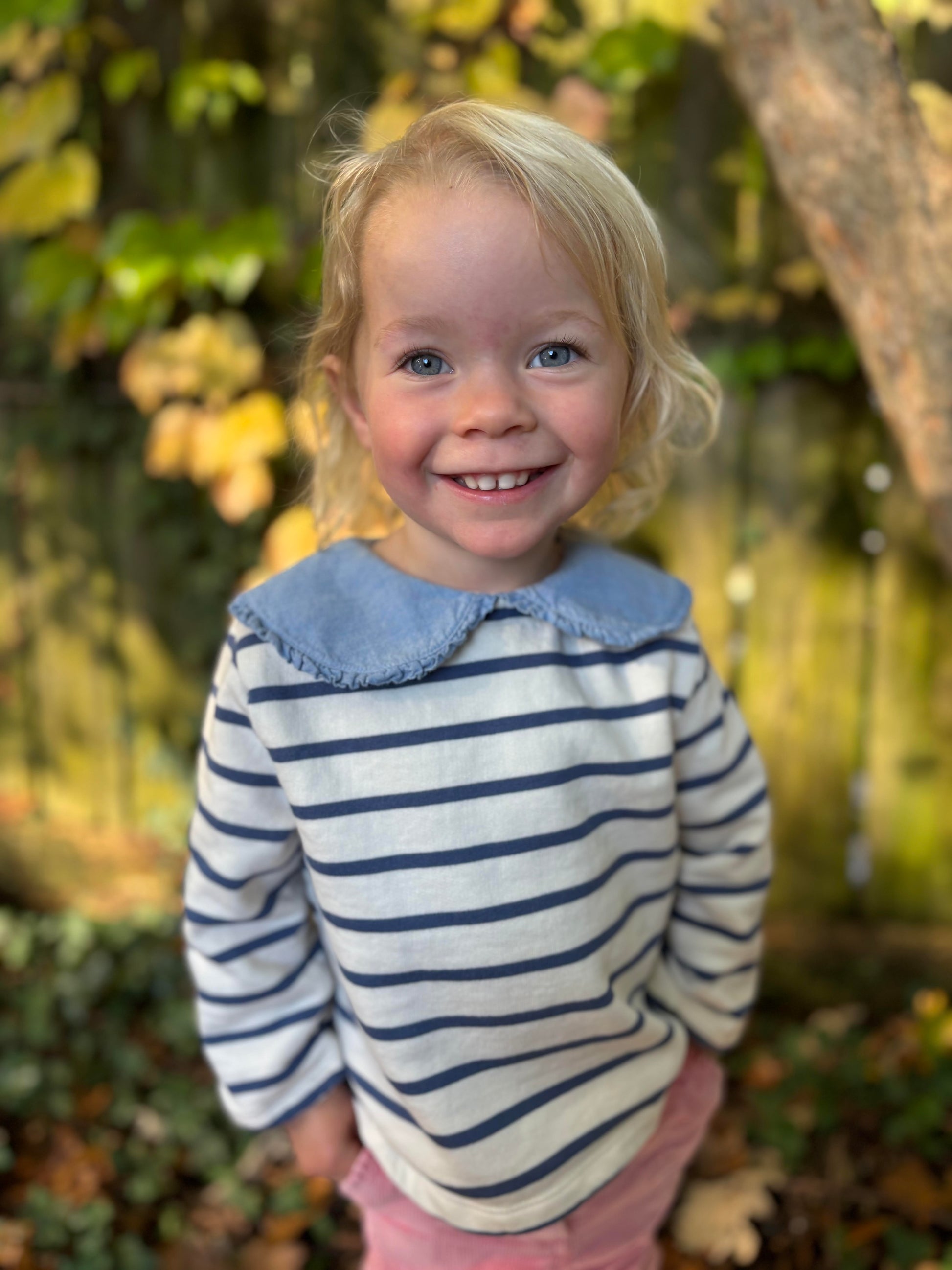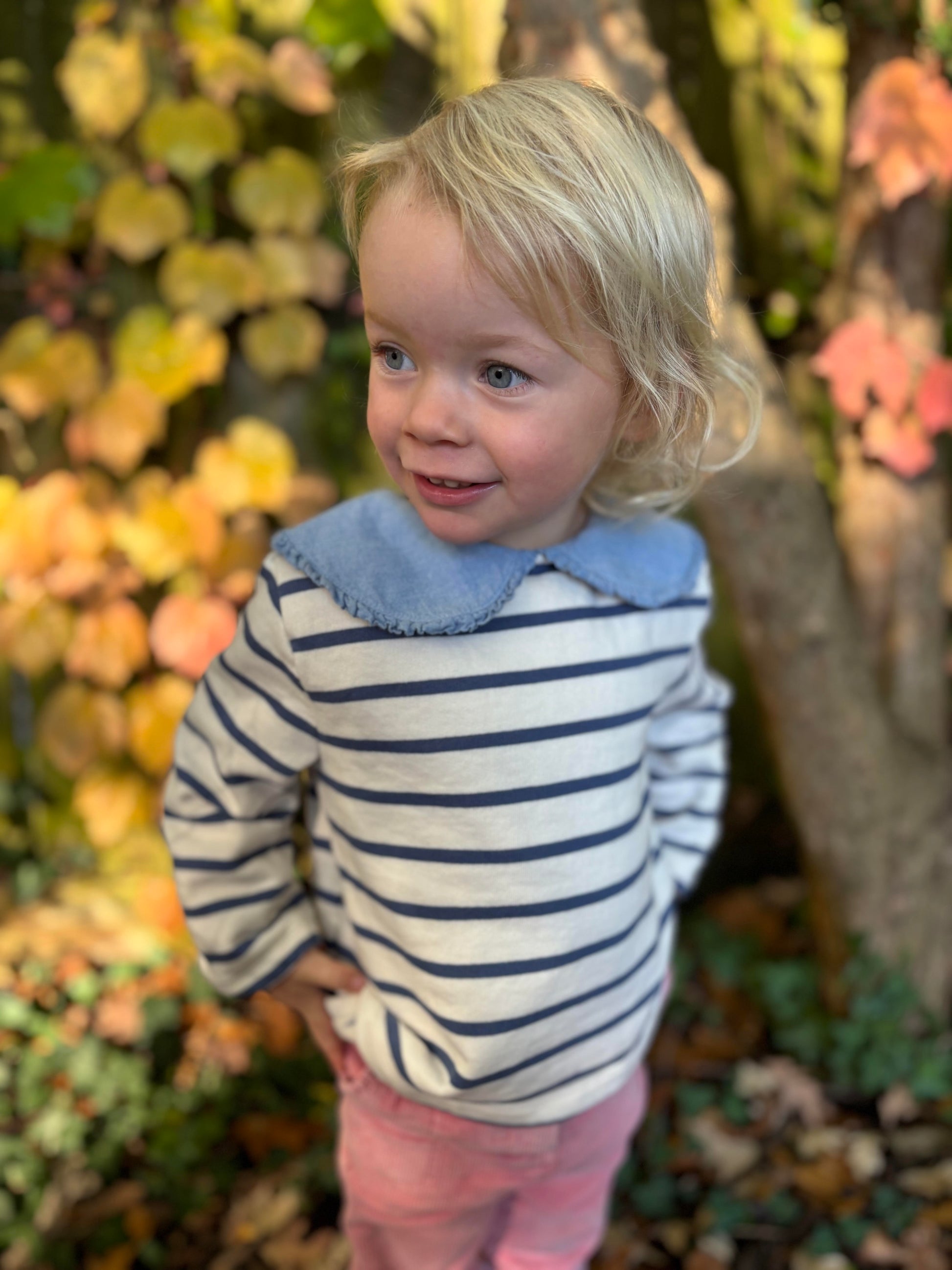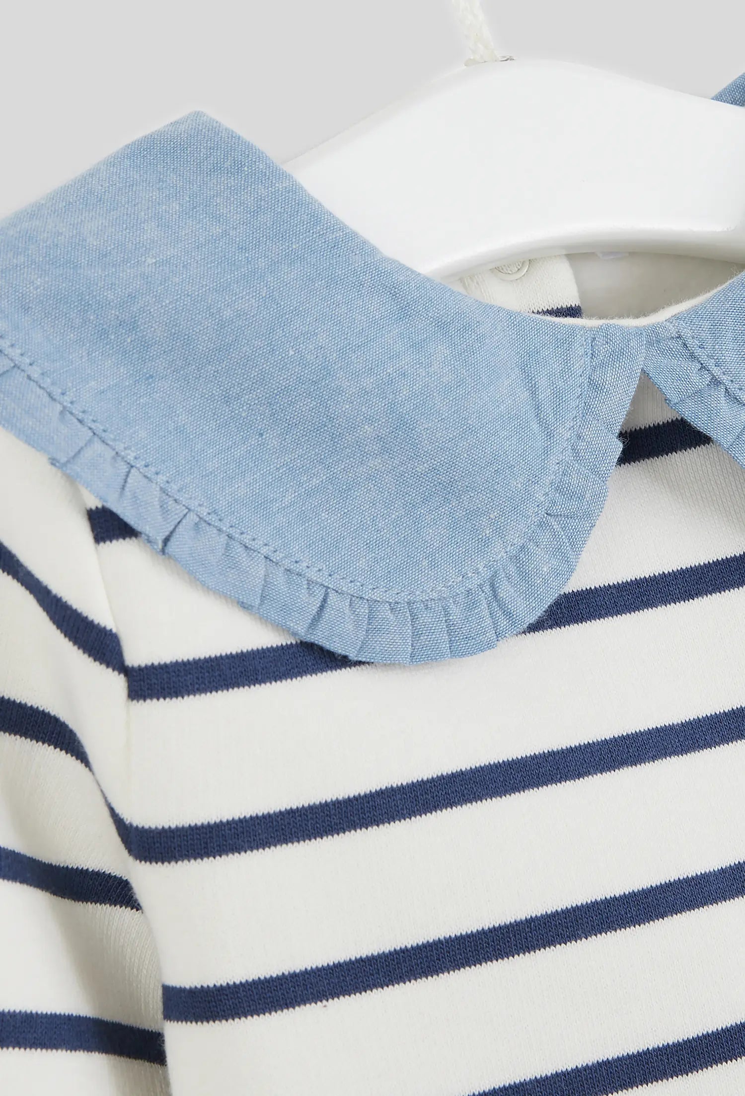 Classic navy stripes dance across a creamy backdrop, while an oversized chambray collar with delicate pleats adds a charming touch of whimsy. A hidden snap closure at the back of the collar makes dressing effortless and polished. Designed for everyday adventures — from city strolls to playground afternoons — Paulette brings effortless French charm to your little one’s wardrobe.